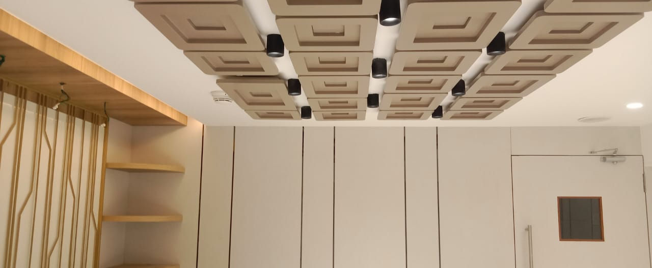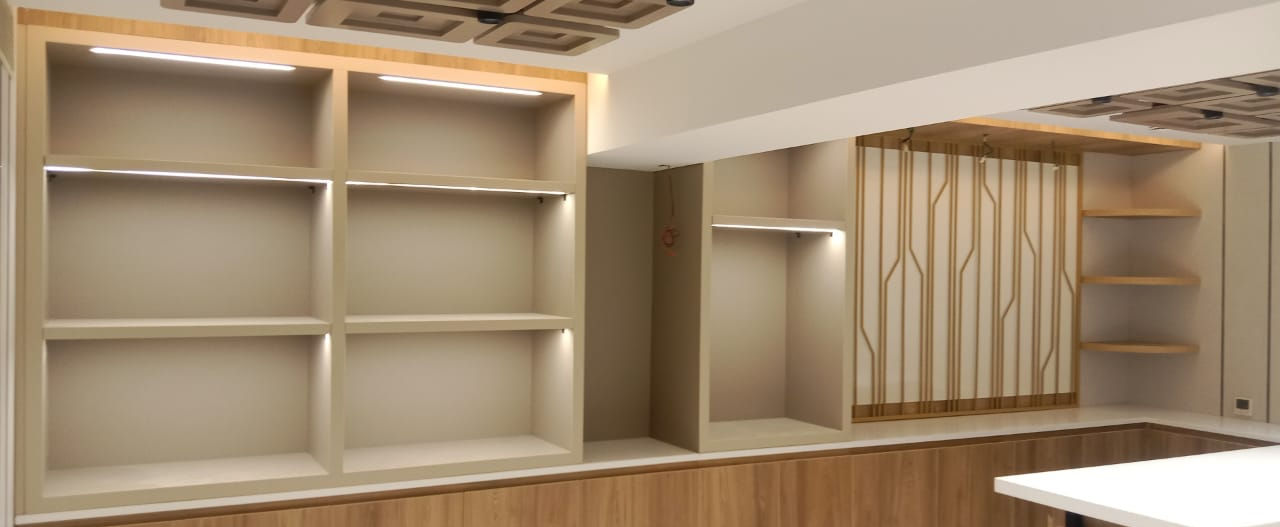 The interior design features a contemporary aesthetic with geometric-patterned ceiling panels, recessed LED lighting, and open shelving units with integrated illumination. The use of wood veneer, acrylic paneling, and warm-toned accents creates a sophisticated yet functional display space.