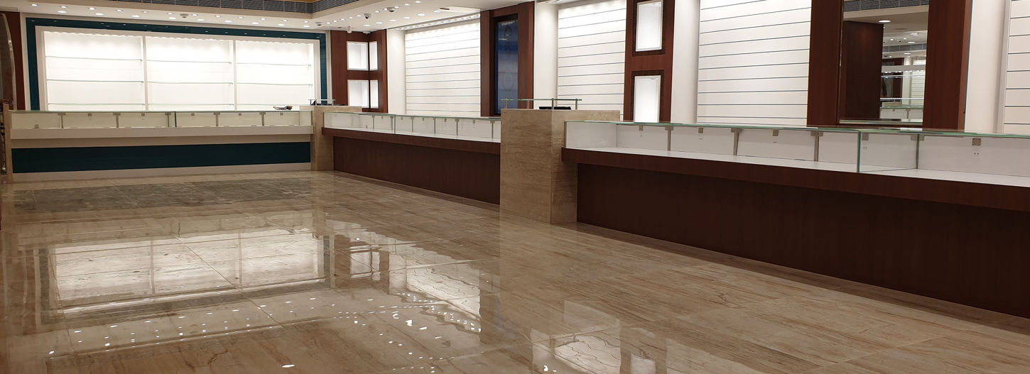 The store's aesthetic is enhanced by the beautiful ivory-colored marble and white ceiling.