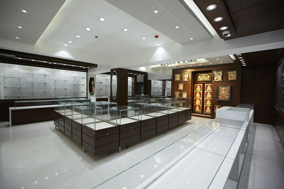 The jewelry store featured a variety of glass-topped counters adorned with elegant dark hardware veneer finishes.