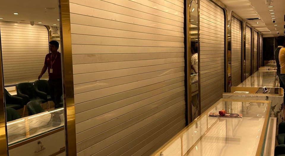 The interior features gold-trimmed rolling shutters integrated into marble-clad walls, framed by large arch mirrors that enhance depth and elegance. Glass display counters with gold accents align with recessed ceiling lights, creating a warm and sophisticated jewellery store ambiance.