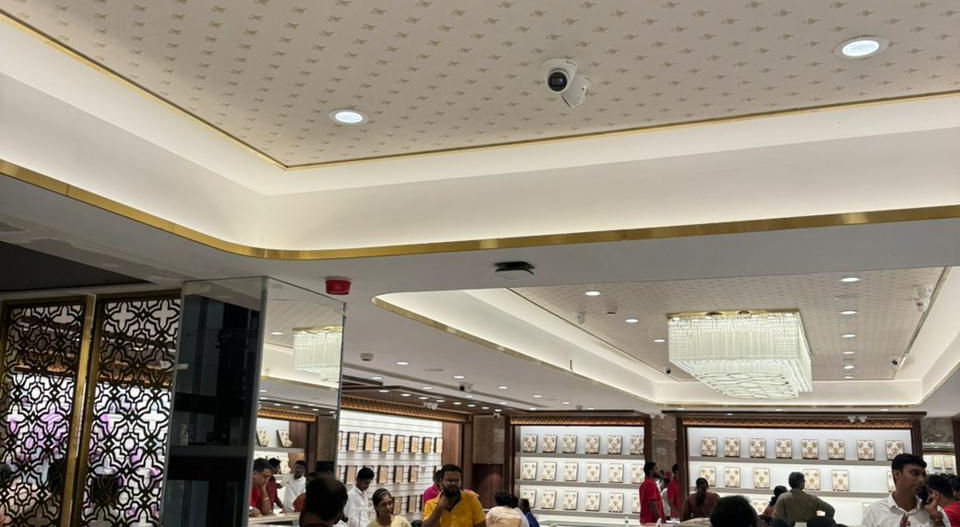 The interior of this exquisite jewellery boutique radiates opulence and sophistication, designed to captivate with its rich, luxurious aesthetic. Gleaming marble floors in soft ivory tones reflect the warm glow of strategically placed crystal chandeliers and recessed LED spotlights, casting a flattering, diamond-like sparkle across the space. Polished gold-trimmed display cases line the walls, showcasing an array of sparkling gems, intricate necklaces, and elegant rings under focused halogen beams that highlight every facet and hue—from deep emeralds to radiant sapphires.