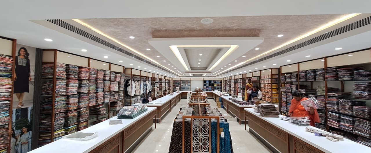 The store is well-lit, with a combination of natural light and artificial lighting that highlights the products on display. The ceiling features an elegant design with recessed lighting and decorative elements that create a warm and inviting atmosphere. In the center of the store, there are tables where more fabrics are displayed, providing customers with a hands-on shopping experience. The decor of the store is sophisticated, with a color scheme that complements the merchandise. The floor is tiled, and the overall ambiance suggests a focus on providing a pleasant shopping experience for those looking for quality textiles. The store appears to cater to a wide range of tastes, offering everything from traditional to contemporary fabric designs.