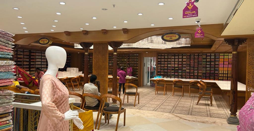 The project features unique color combinations and designs on each floor. Within the main entrance lobby, a stunning Design + Poster display is situated at a double-height ceiling, capturing the attention of all who enter. Each floor ceiling showcases a refined design, embellished with recessed lighting and decorative elements that evoke a warm and inviting atmosphere. Within the store's central area, customers will discover tables adorned with an array of fabrics, providing a tactile shopping experience. The store's decor exudes sophistication, featuring a well-coordinated color scheme that perfectly complements the merchandise. The tiled floor adds to the overall ambiance, emphasizing the store's commitment to delivering a delightful shopping experience for those seeking premium textiles