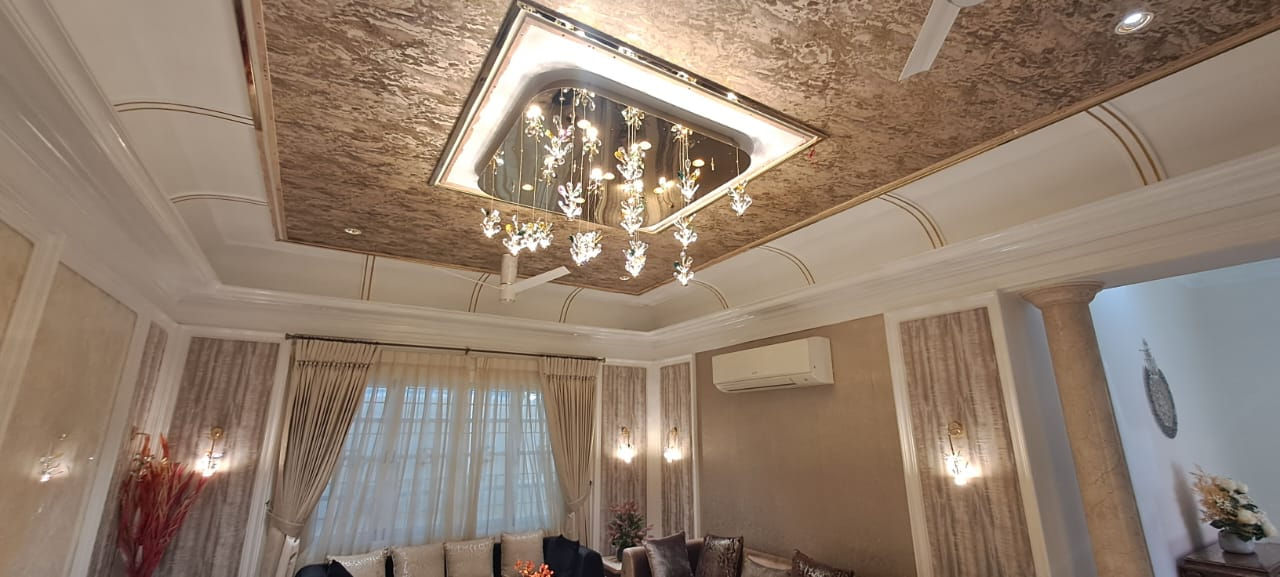 In this luxurious living room, the beautiful ceiling serves as a stunning backdrop to an environment filled with comfort and style. It is a perfect blend of aesthetic appeal and functionality, making it an ideal retreat for relaxation and social gatherings alike.